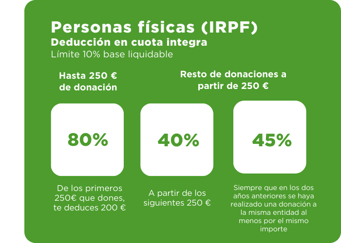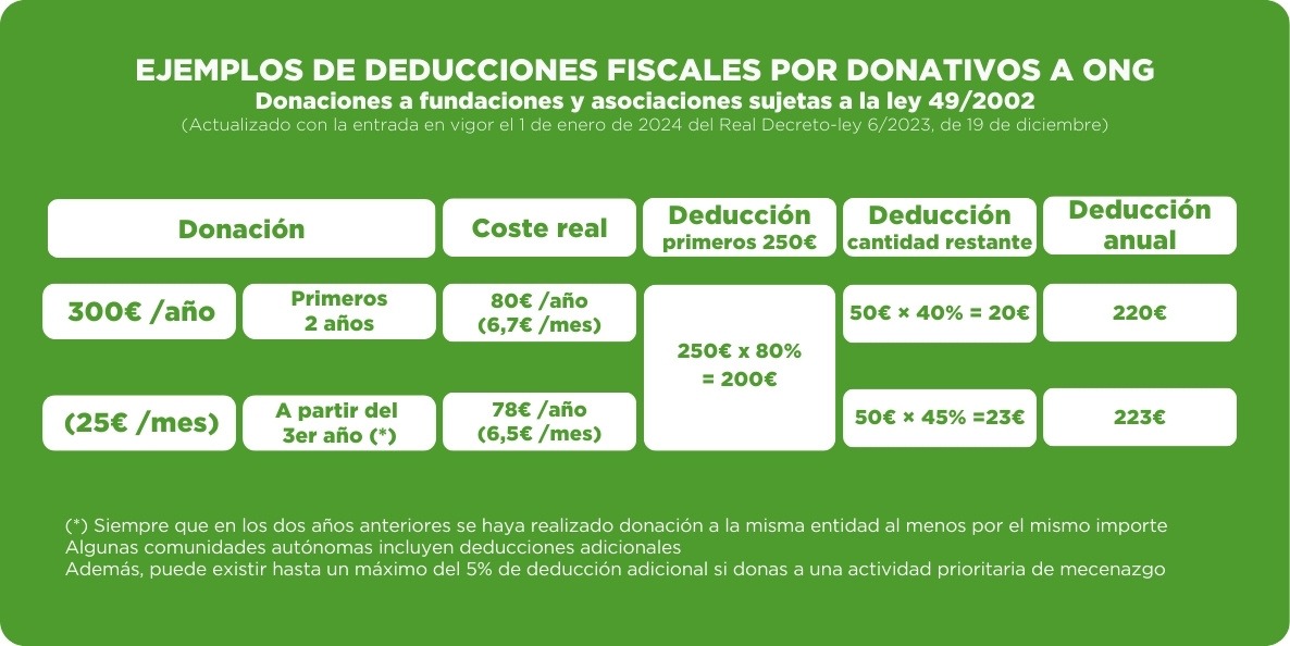 Existen deducciones fiscales por donativos a ONG que pueden ir del 40% al 80% en el Impuesto sobre la Renta de las Personas Físicas (IRPF). De los primeros 250 € que dones, te deduces 200 €. Estos son los porcentajes de deducción actualizado tras la entrada en vigor el 1 de enero de 2024 del Real Decreto-ley 6/2023, de 19 de diciembre.