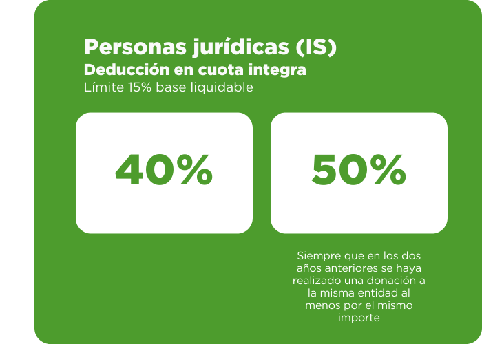El porcentaje de deducción por donativos a ONG en cuota en el Impuesto sobre Sociedades (IS) es del 40% (con el límite del 15% de la base imponible). Esta deducción se incrementa al 50% si se han realizado donativos de al menos el mismo importe a la misma entidad en los dos ejercicios anteriores. Esto aplica a fundaciones y asociaciones sujetas a la ley 49/2002, como es el caso de InteRed.